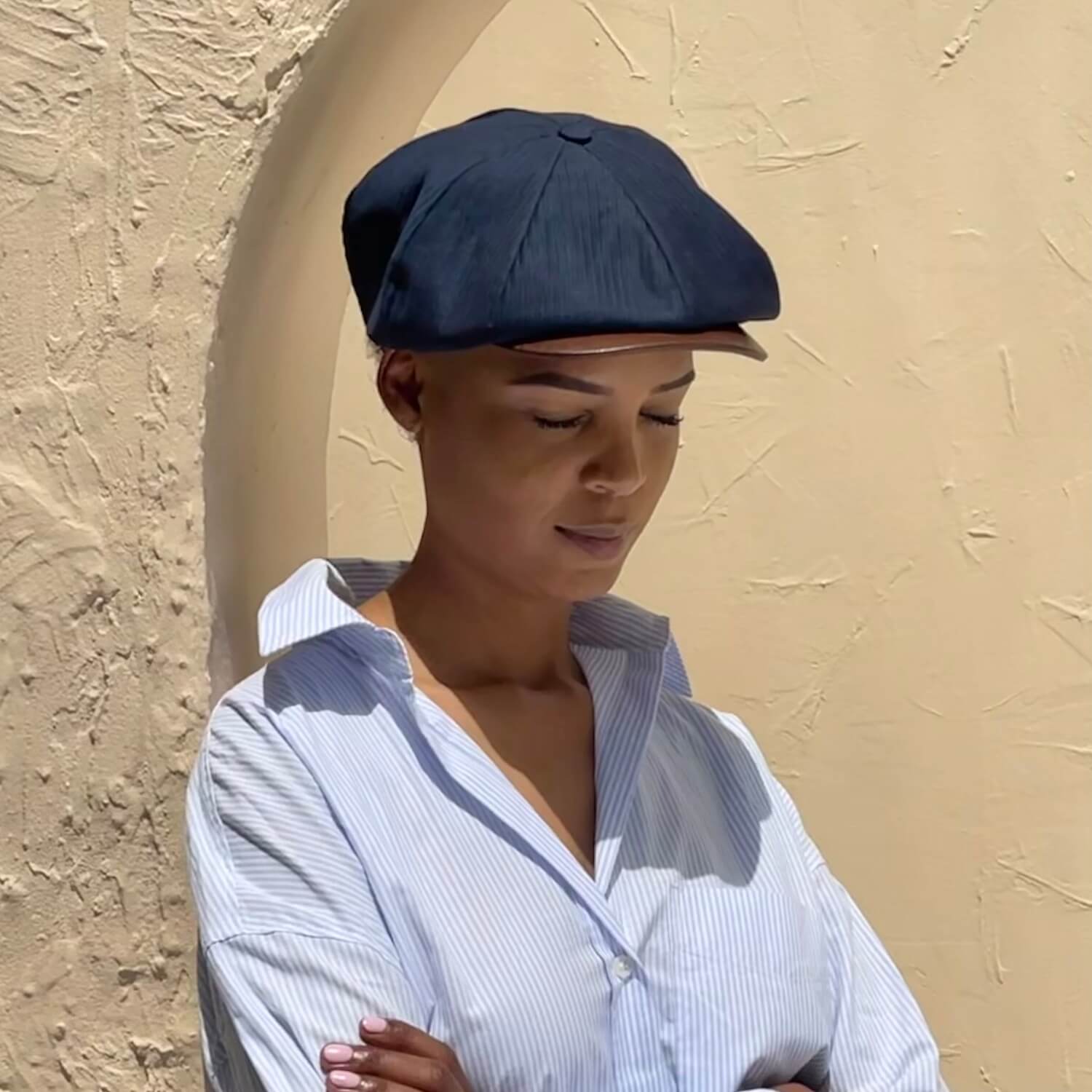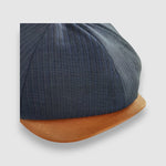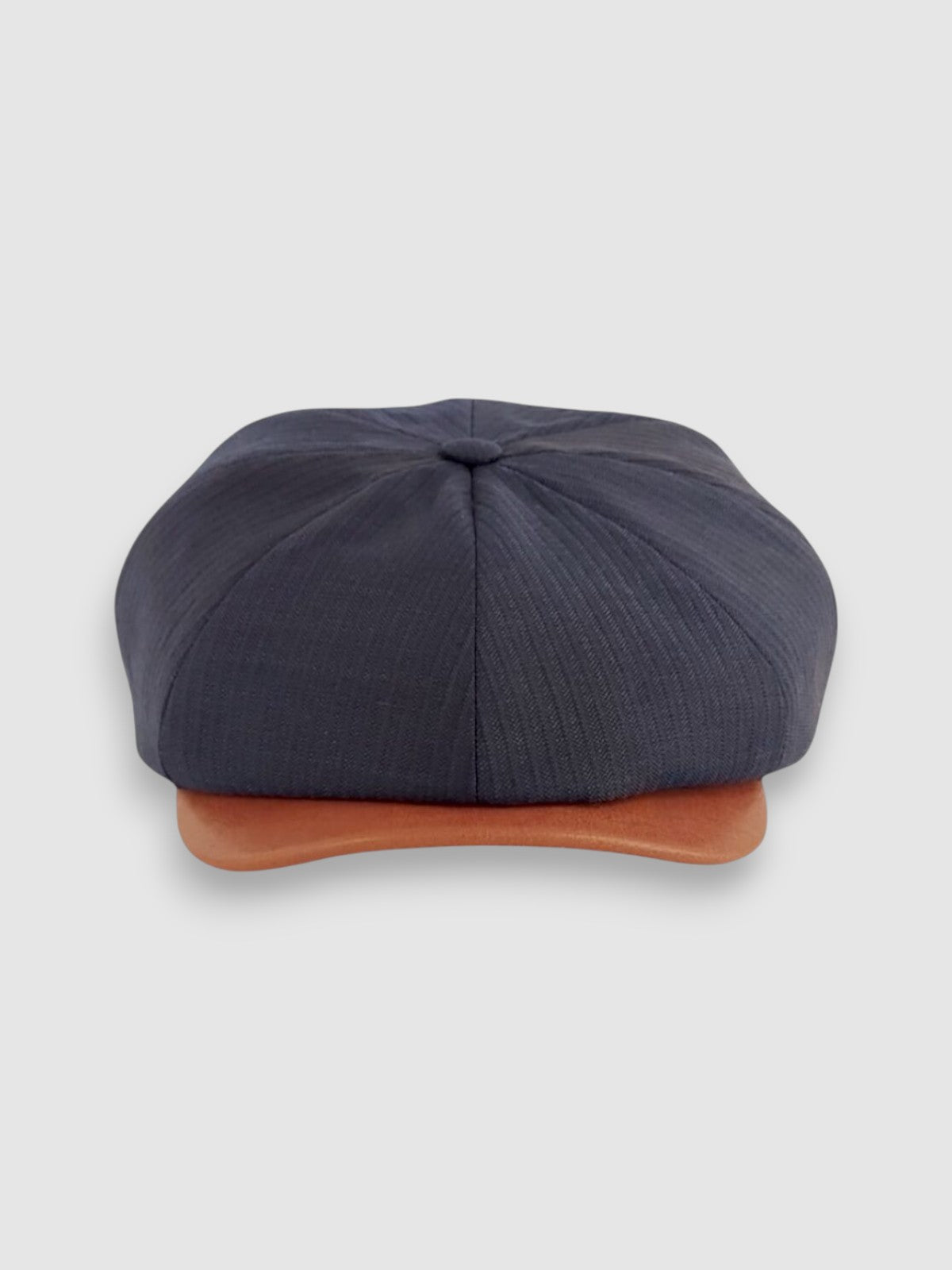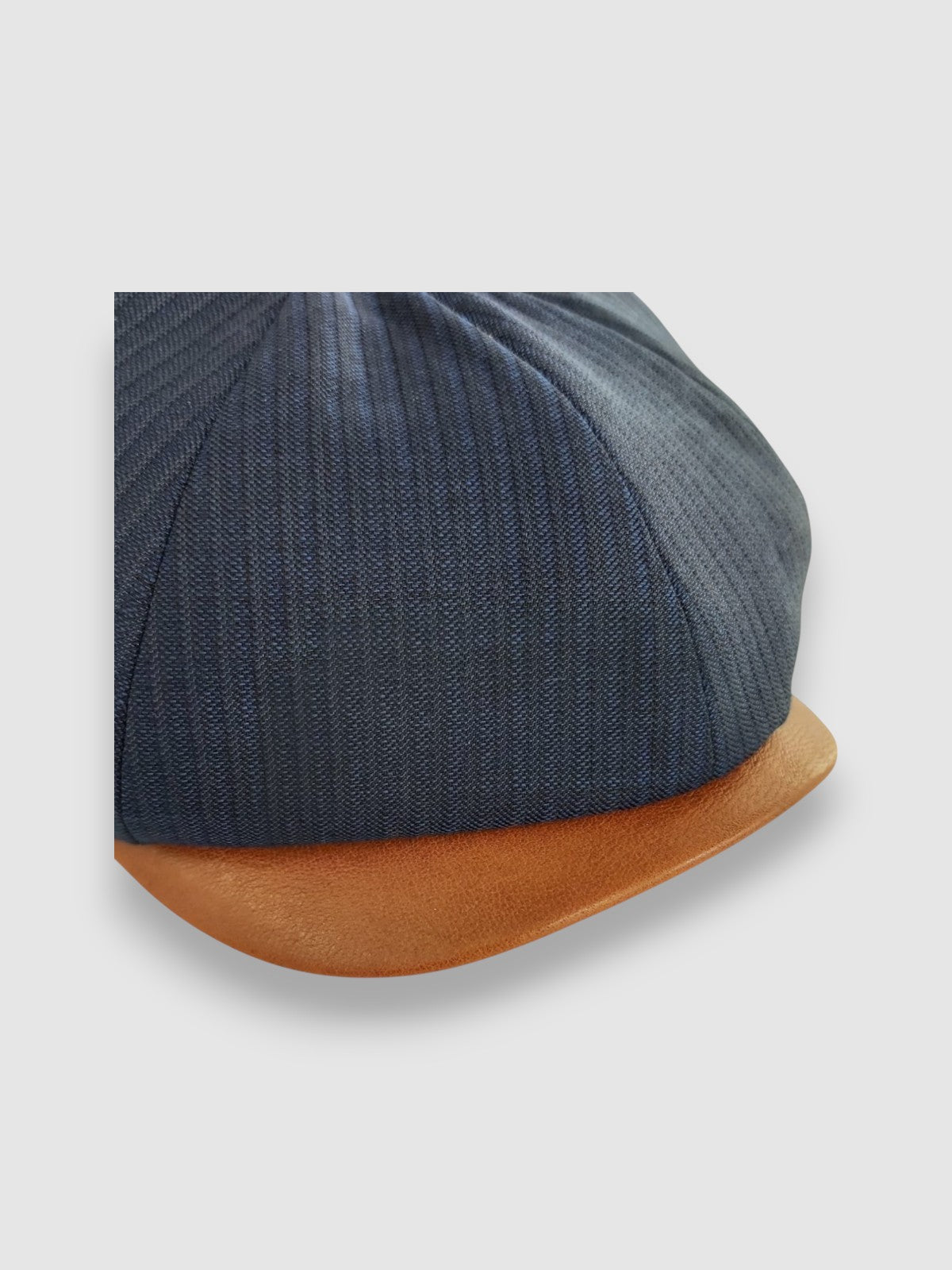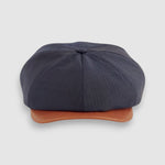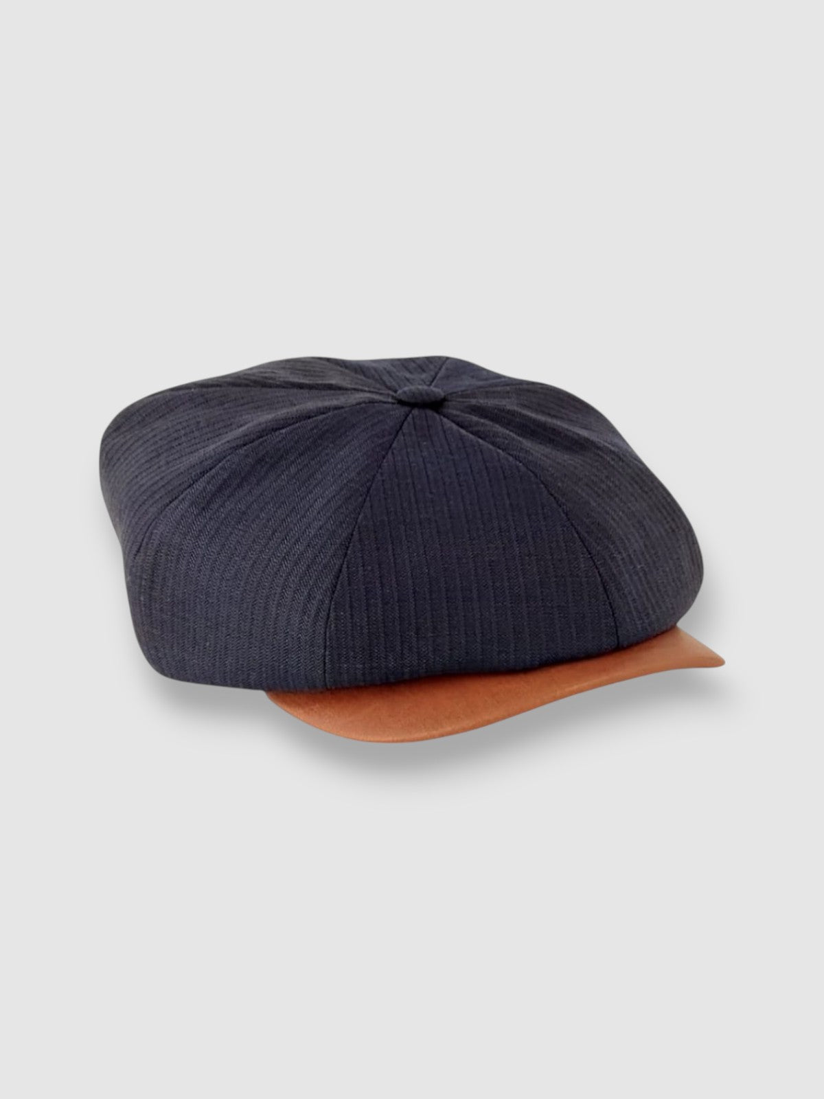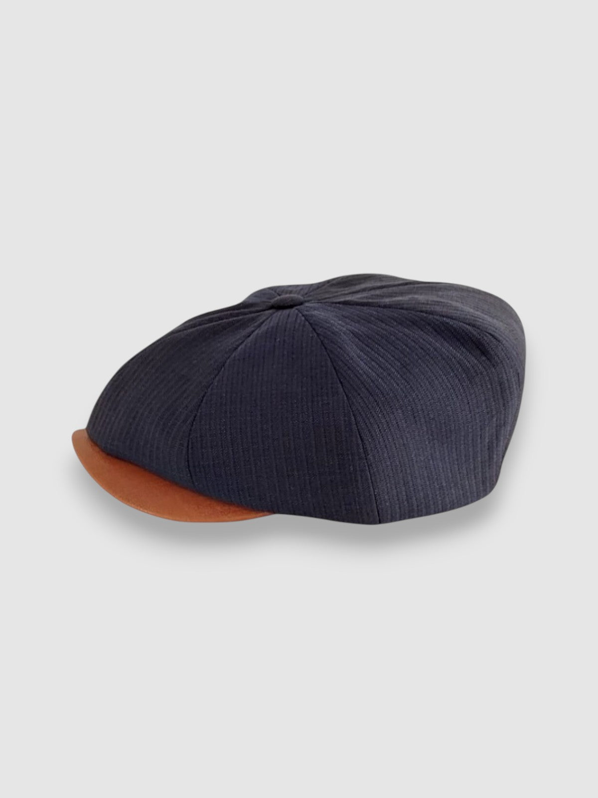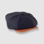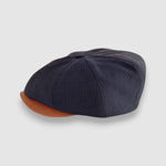 Discover the Striped Theo: a cool classic Newsboy cap in lightweight navy blue feather stripe worsted wool with a contrast butter-soft tan leather peak. There's a stud button for it to be snapped up or swung sideways to suit your mood. Looking dapper has never been easier, dressed up or down.